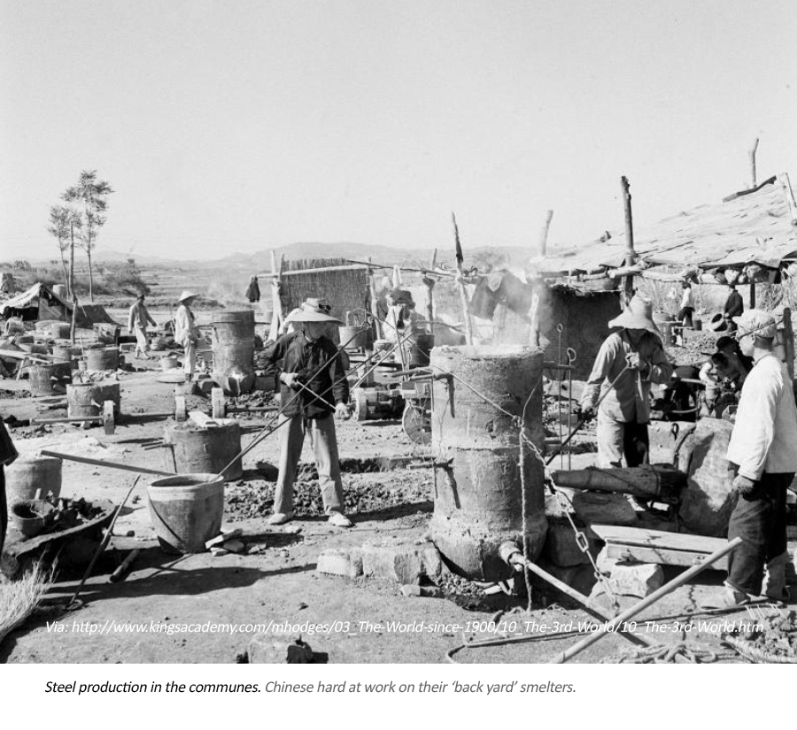 - To surpass industrial difficulties, Mao called on every labourer to produce steel by building blast furnaces on each farm instead of cultivating their fields to bring in the much-needed crops.